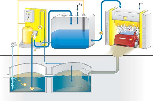 Из насосного отстойника вода подается погружным насосом сначала в песочно-гравийную фильтрующую колонну, где происходит очистка сточных вод от механических примесей, а затем – в фильтрующую колонну с сорбентом, где производиться доочистка от нефтепродуктов. Далее вода поступает резервуар для хранения воды, предназначенной для мойки автомобилей.Для уничтожения микробов в воде и во избежание раздражения от запаха в системе предусмотрен бачок для химии, из которого химия добавляется в воду через электромагнитный клапан автоматически (опция).